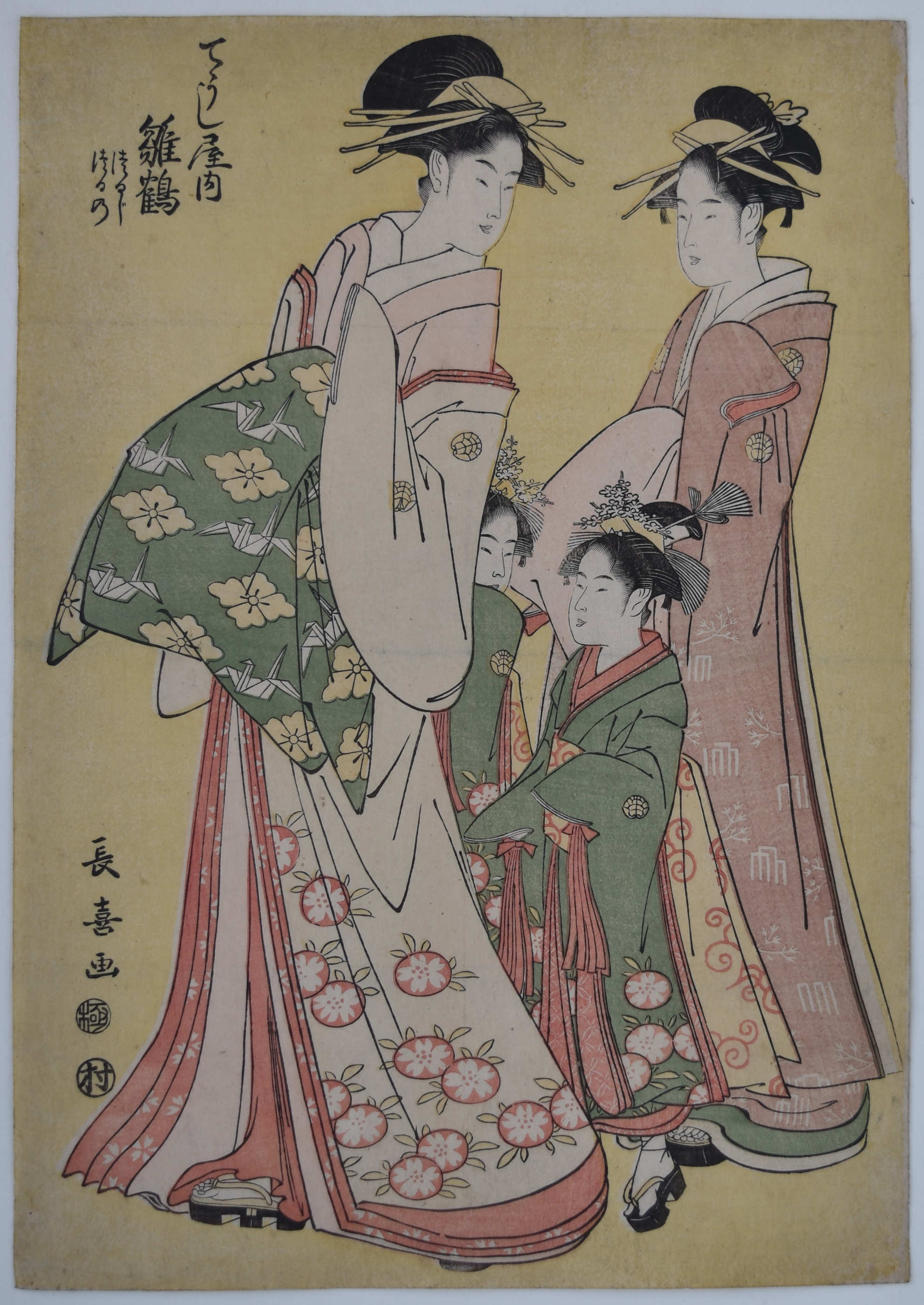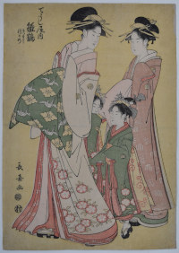 A yellow ground aiban showing the high-ranking courtesan Hinazuru of the Chojiya House with her two kamuro Tsuruji and Tsuruno. Little is known of his life: Probably a pupil, together with Utamaro, of the artist Toriyama Sekien. His output was limited, leaving a small corpus of work, but some acknowledged masterpieces. Signed with two go: Choki, in the style of Kiyonaga, and Shiko in the style of Utamaro. Published by Murataya Jirobei (Eiyudo) c. 1795.