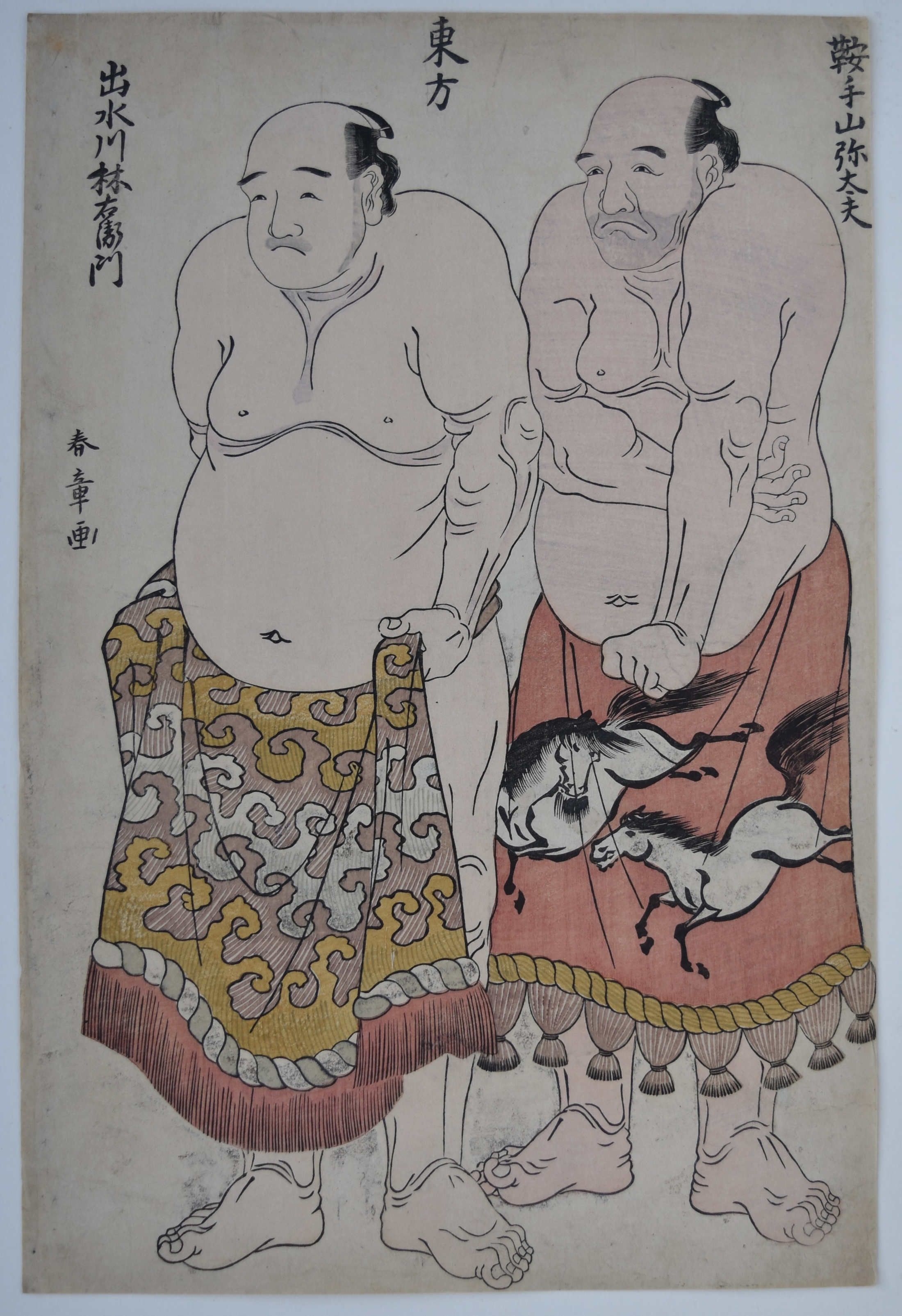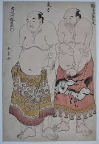 Two sumo wrestlers from the East Side: Kurateyama Yadayu (right) and Izumigawa Rin’emon (left) from a fine set of double portraits: 5 from the West Side, 6 from the East Side. No publisher’s seal but probably published by Toyoshimaya Bunjiemon (Bunkindo) c. mid 1780s.