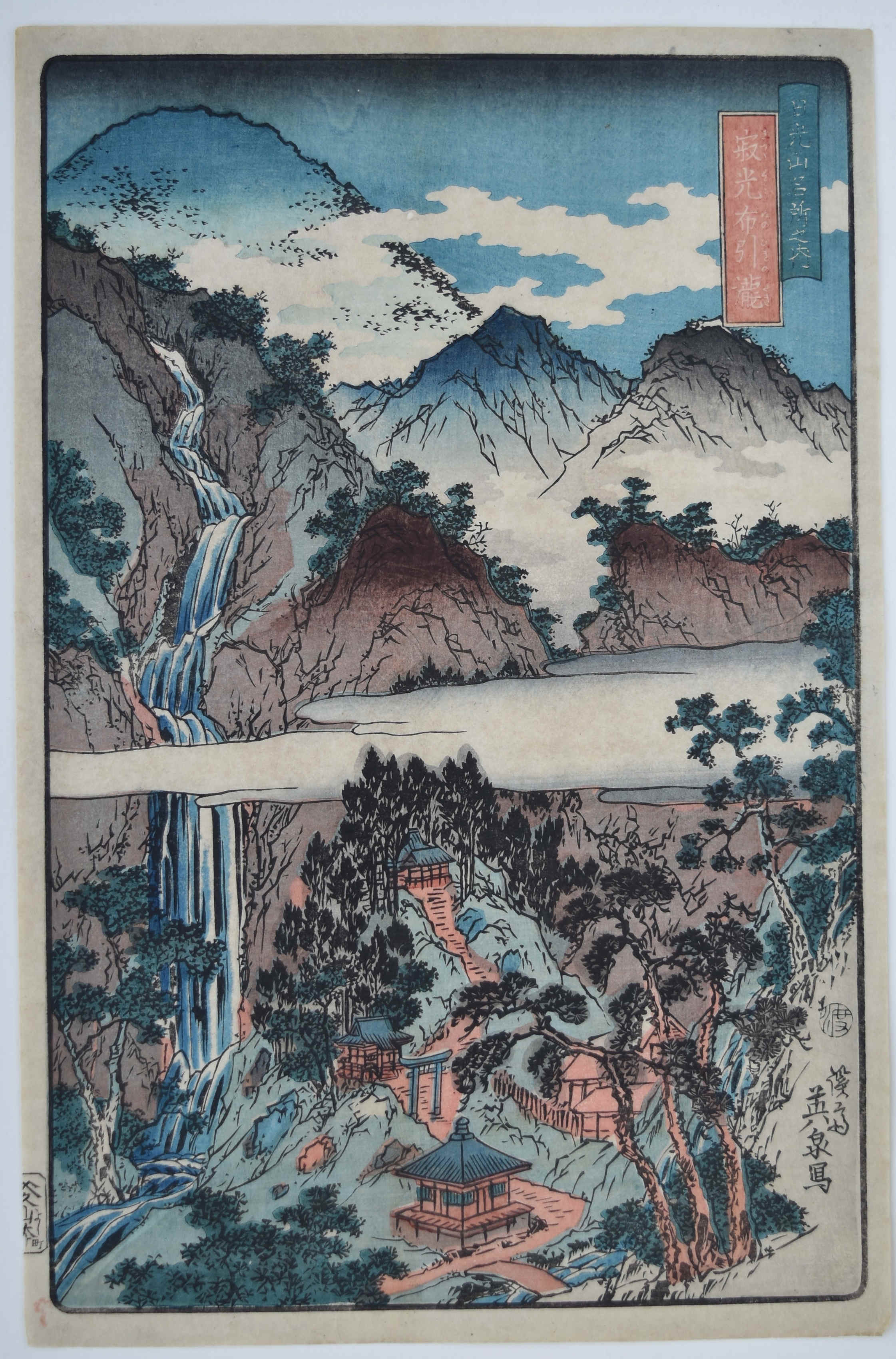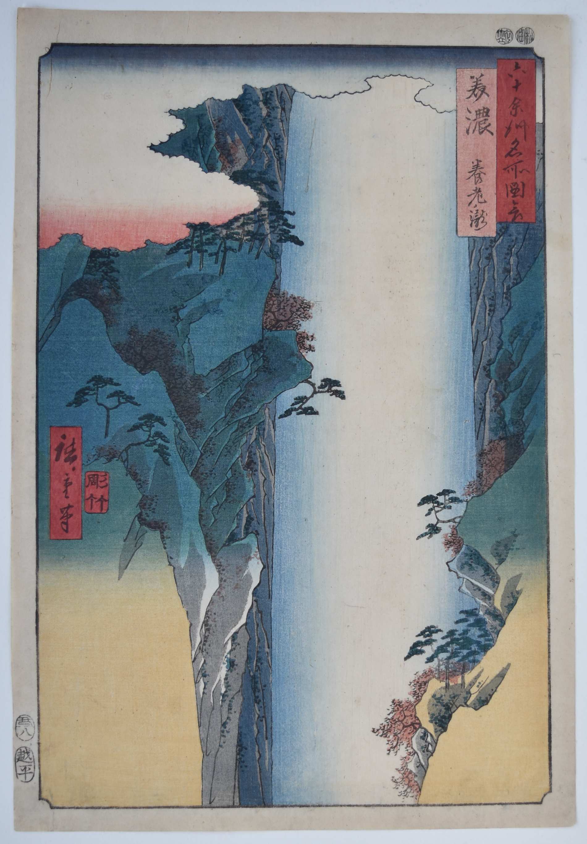 Very good impression with blind-printing on the waterfall. Fine colour. Very good condition. Signed Hiroshige ga.