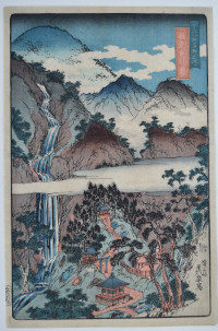 Jakko Nunobiki no taki, “The Hanging Cloth Waterfall at Jakko Shrine.” So-called because it falls in seven-tiers. The shrine is seen below the fall. From a set of five prints: It was probably intended to be a set of three prints but another two were added, possibly with the intention of going on to emulate Hokusai’s waterfall set. Nikkosan meisho no uchi, “Celebrated Views in the Nikko Mountains.” Published by Yamamotoya Heikichi (Eikyudo) c. 1843-47. In contrast to Hokusai’s set, Eisen’s have a more muscular appearance. See: The Japanese Print: A New Approach, J. Hillier, Bell & Son, 1960, Chapter XVI, where Jack Hillier discusses Eisen and his landscapes and considers this set “… is perhaps the crowning achievement of his career as a designer of landscape prints.”