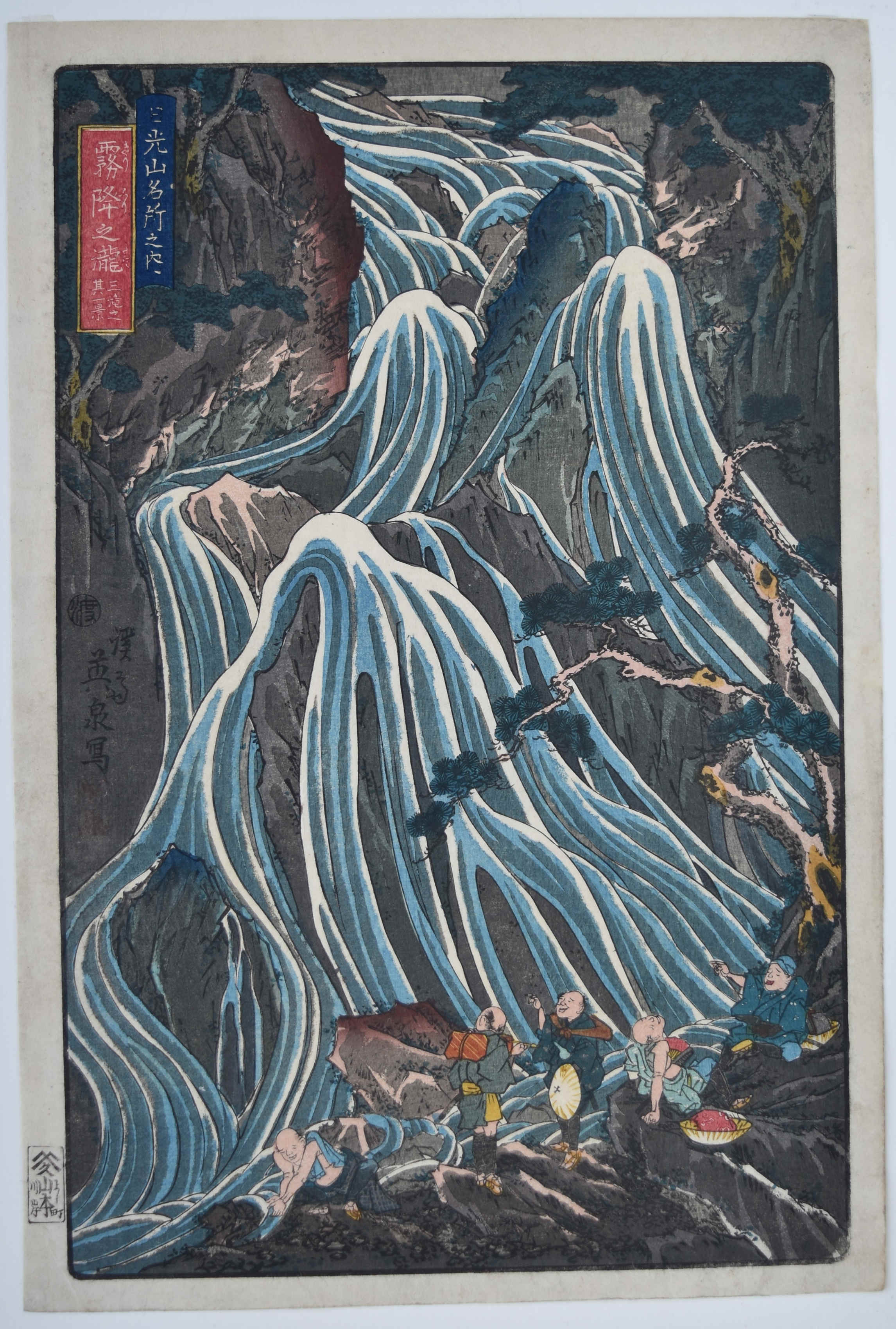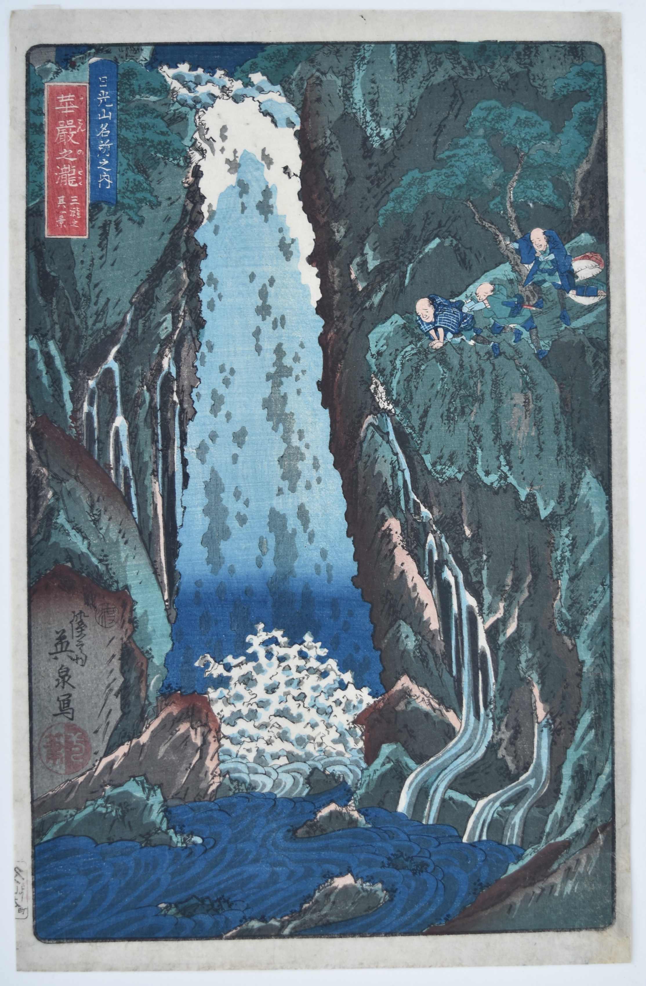 Kegon no taki, santaki no sono ikkei, “ The Kegon Waterfall, View of One of the Three Falls.” From a set Nikkosan meisho no uchi, “Celebrated Views in the Nikko Mountains.” Three travellers rather precariously perched on a ledge looking down at the fall. From a set of five prints: It was probably intended to be a set of three prints but another two were added, possibly with the intention of going on to emulate Hokusai’s waterfall set. Published by Yamamotoya Heikichi (Eikyudo) c. 1843-47. In contrast to Hokusai’s set, Eisen’s have a more muscular appearance. See: The Japanese Print: A New Approach, J. Hillier, Bell & Son, 1960, Chapter XVI, where Jack Hillier discusses Eisen and his landscapes and considers this set “… is perhaps the crowning achievement of his career as a designer of landscape prints.”