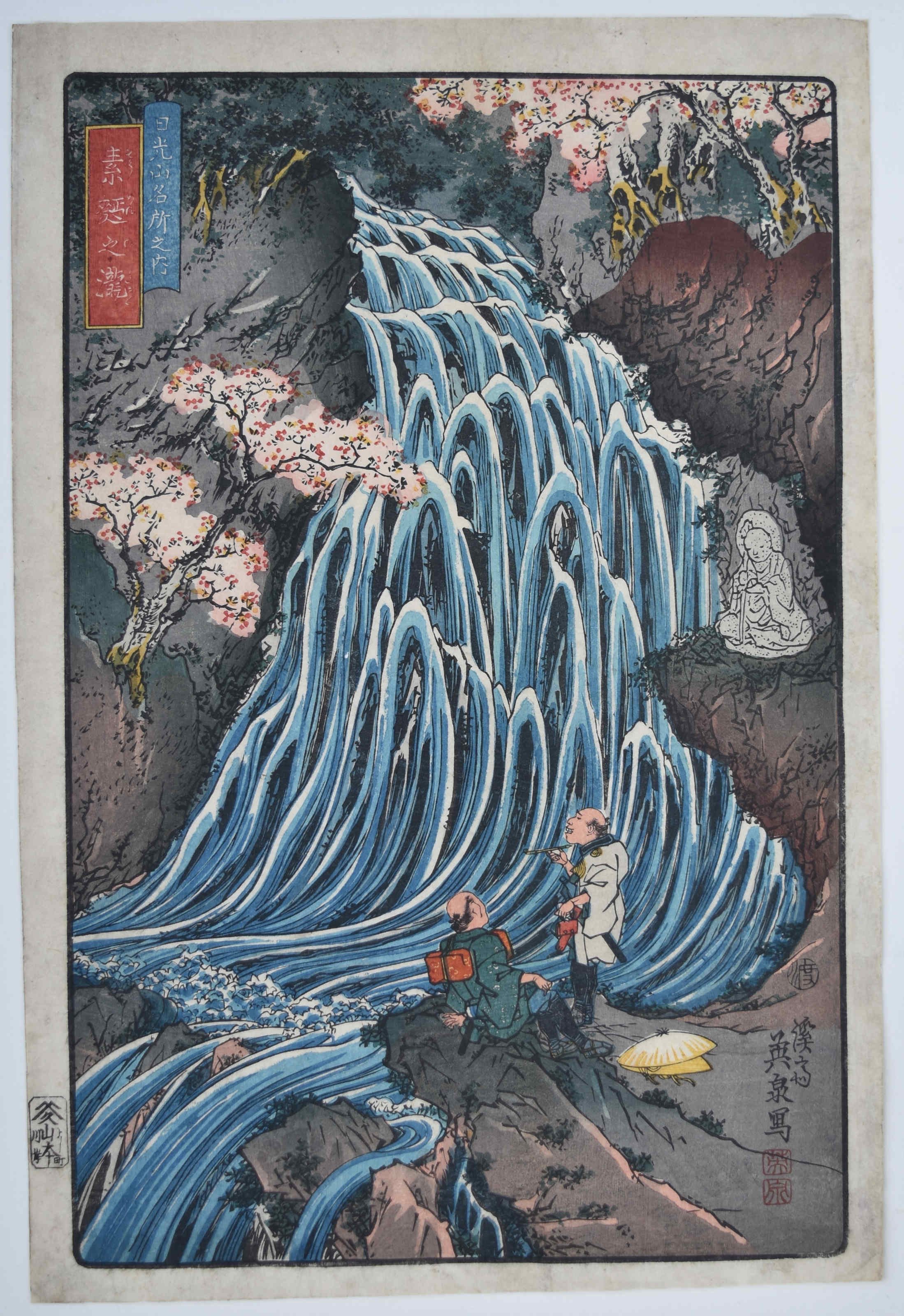 Somen no taki, “The Wheat Noodle Waterfall.” From a set Nikkosan meisho no uchi, “Celebrated Views in the Nikko Mountains.”Two travellers admire the fall from below. On a ledge above them is a stone statue of Jizo Bosatsu, the deity of travellers. From a set of five prints: It was probably intended to be a set of three prints but another two were added, possibly with the intention of going on to emulate Hokusai’s waterfall set. Published by Yamamotoya Heikichi (Eikyudo) c. 1843-47. In contrast to Hokusai’s set, Eisen’s have a more muscular appearance. See: The Japanese Print: A New Approach, J. Hillier, Bell & Son, 1960, Chapter XVI, where Jack Hillier discusses Eisen and his landscapes and considers this set “… is perhaps the crowning achievement of his career as a designer of landscape prints.”