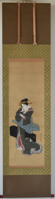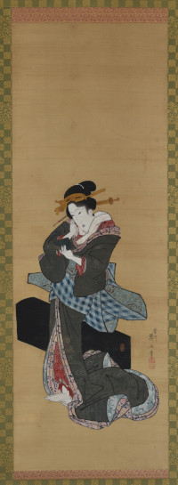 An original painting by Eizan, sumi and full colour on silk, 37 x 13 in; 94 x 33 cms. Eizan was the leading exponent of bijinga in the early 1800s. He founded the Kikukawa School with Eisen his best known pupil. He was left-handed which was somewhat unusual. Shows a standing geisha, her shamisen case at her feet. This musical instrument was frequently associated with the world of courtesans.