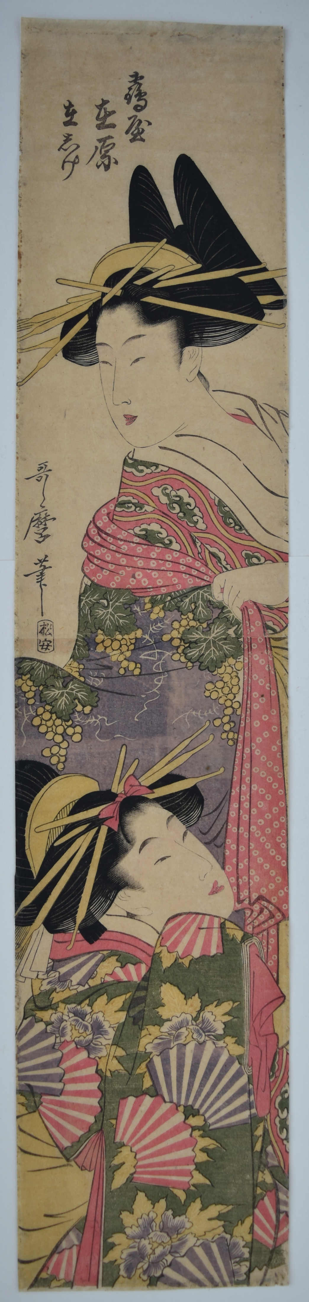 A pillar print showing the courtesan Ariwara and her young attendant Arishige (below), both of the Tsuruya House. Utamaro’s output of hashira-e was not as great as some other artists, and they are especially difficult to find in good condition because of often being hung on pillars and in alcoves where they were subject to fading and toning. Another trimmed and somewhat faded impression is in the B.M. 1907, 0531, 0. 474. Published by Matsuyasu , c. 1803.