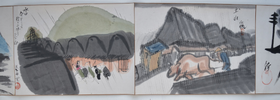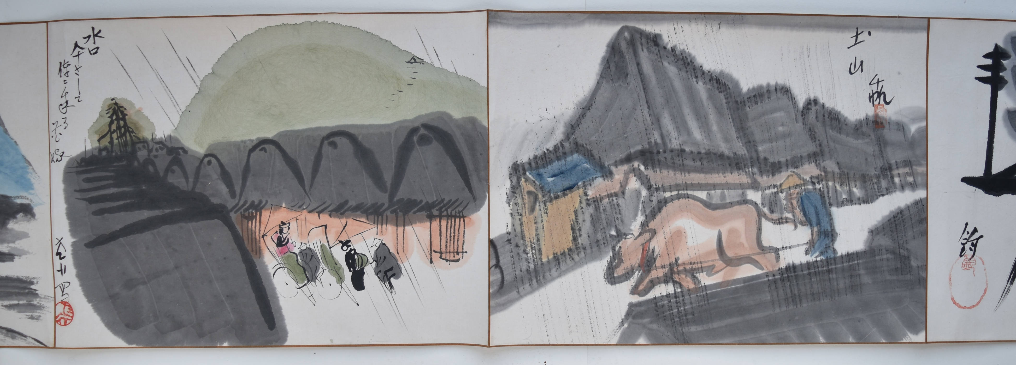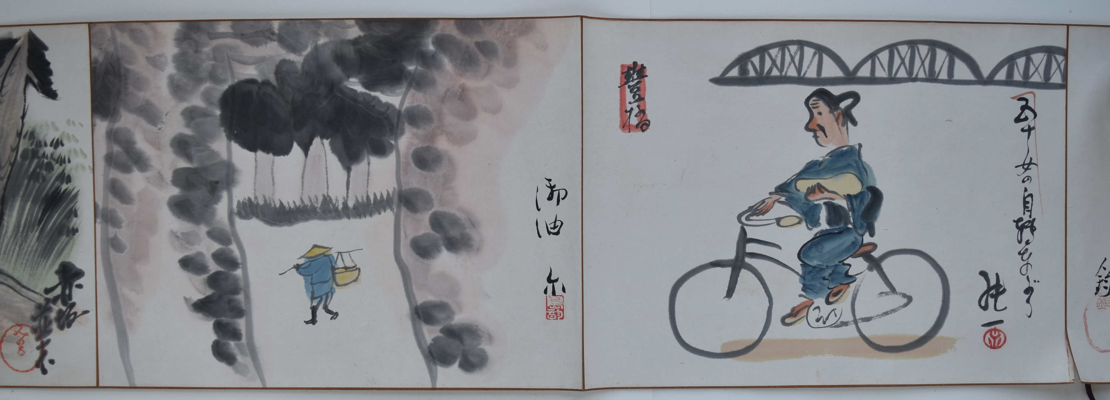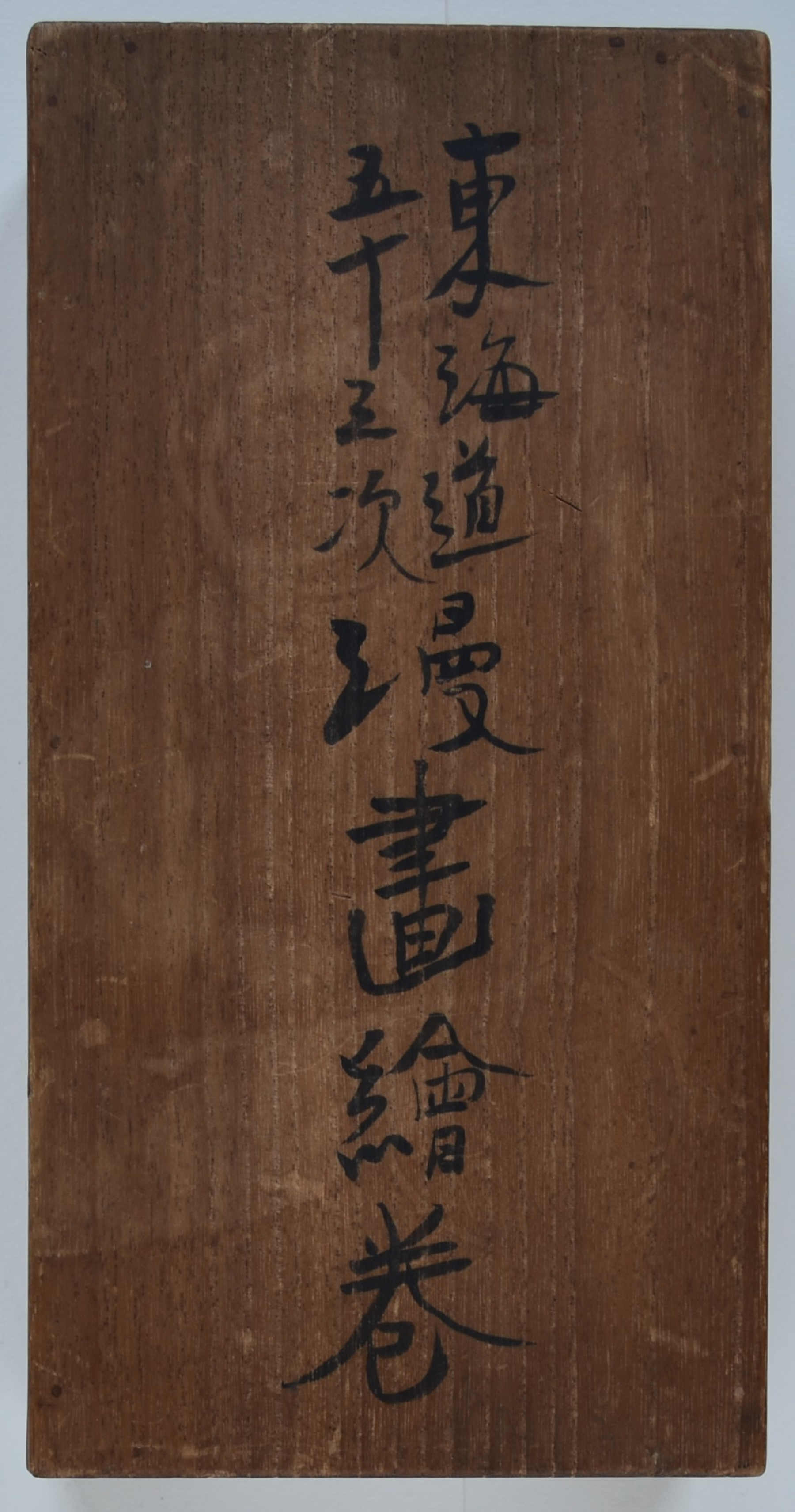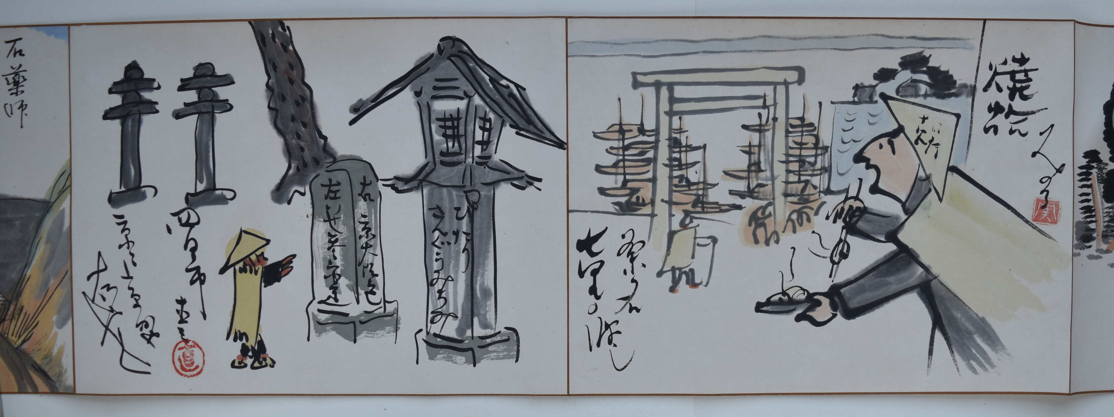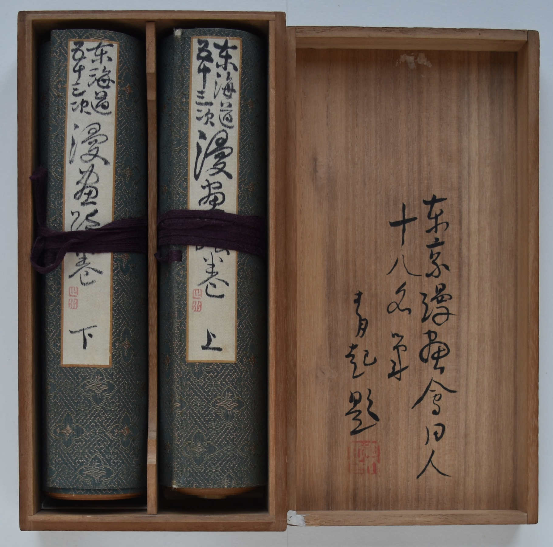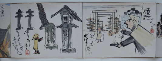 A set of two handscrolls in original paulownia storage box, 30 feet x 10 in; 914.4 x 25.4 cms. Sumi and full colour on paper by 18 artists of the Tokyo Manga Association, produced in 1921: 27 paintings in scroll 1; 28 paintings in scroll 2. The scrolls are a modern manga rendering of the Tokaido Road in homage to Hiroshige, the artists following and interpreting the same route that Hiroshige walked. Satirical and comedic showing the modernisation of Japan at a time manga was gaining popularity due to publications like the Jiji Manga newspaper supplement, previously known as the Ponchi, “Punch.” 150 sets were produced (although some sources give as many as 250-300 being made). No two sets are exactly the same ; indeed, some artists changed their designs substantially. Tokaido gojusan-tsugi Manga emaki, “Manga Handscrolls of the Fifty-three Stations of the Tokaido Highway.” Inside lid inscription: Tokaido emaki, dojin juhachi mei hitsu, “Tokaido handscrolls, painted by eighteen members.” Tokyo Chuo Bijutsukai dated Taisho 10 (1921).