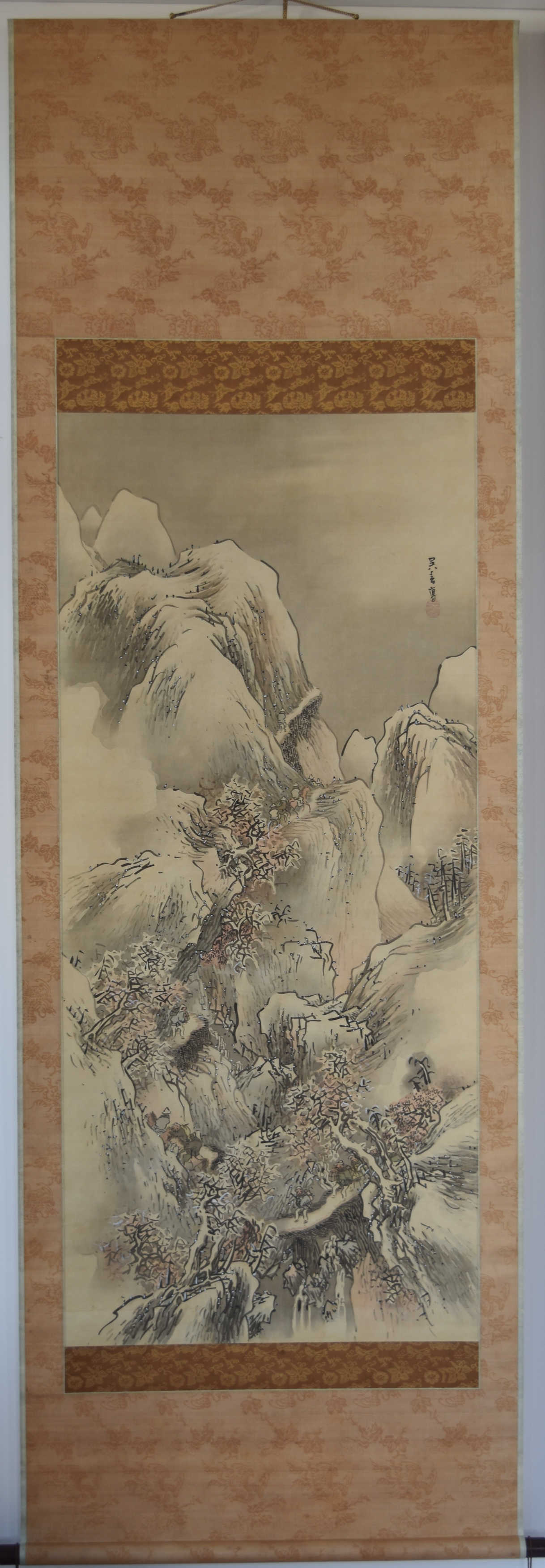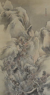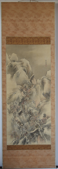 An original painting, sumi and light colour on silk, 49 x 22 in; 124.5 x 56 cms. Shows a mountainous landscape in snow with figures on a narrow footpath between overhanging cliffs. Goshun was a highly influential artist, known for his geniality and mastery, not only of painting, but of poetry and calligraphy. A pupil of Yosa Buson and then much influenced by Okyo. Founded the Shijo School (named after the street on which he lived in Kyoto). His mature style dates from around 1795.