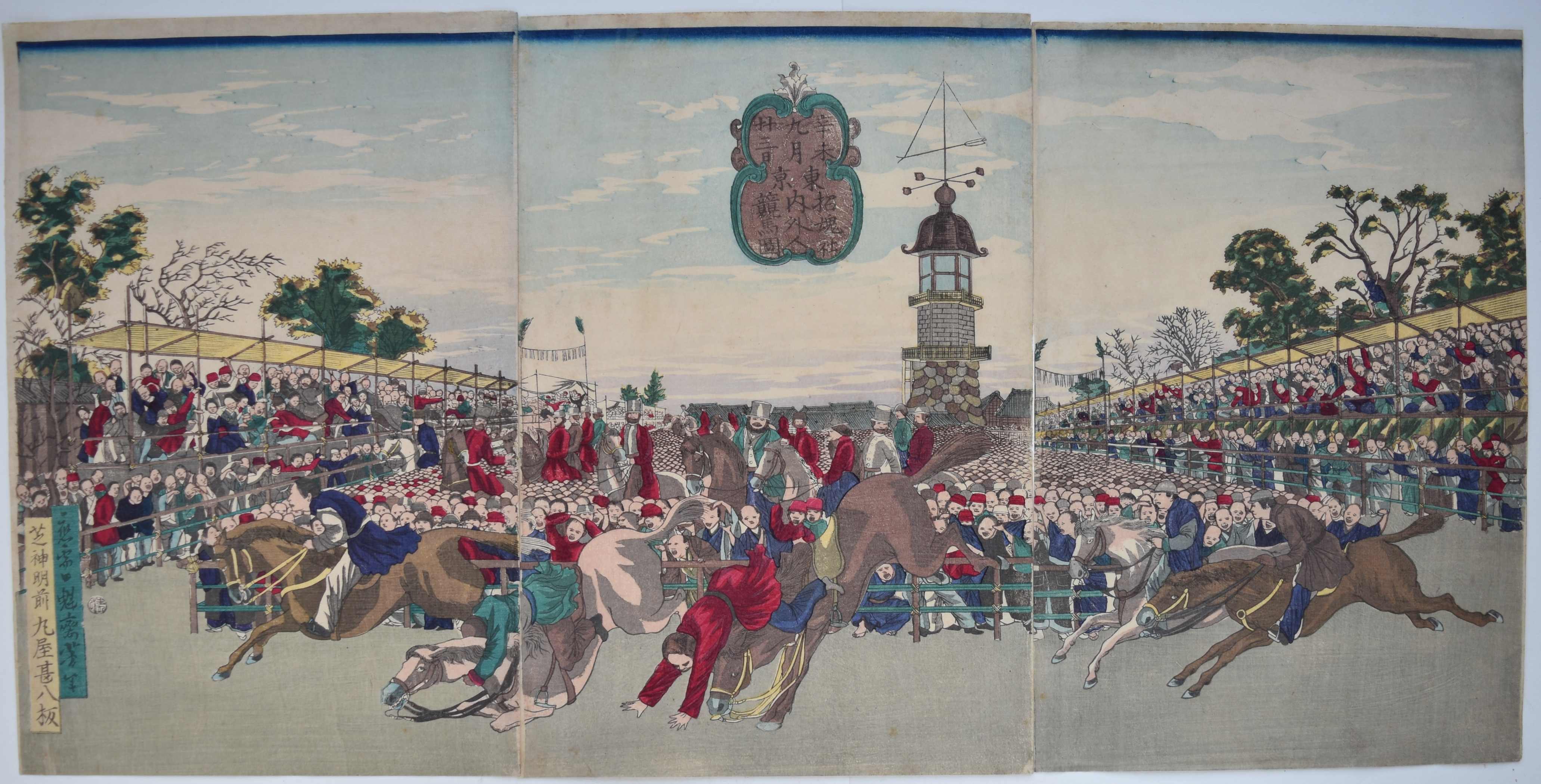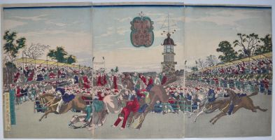 A triptych showing horse racing in Tokyo. Tokyo Shokonsha [the original name of the Yasukuni Shrine] naigaijin keiba no zu, “Horse Racing for Foreigners and Japanese in Shokonsha Tokyo.” From Tokyo kaika kyoga meisho, “Comic Pictures of Civilised Tokyo.” Published by Maruya Jinpachi (Marujin) 1871. The first Western-style horse racing was established by – mainly British – residents in the form of the Yokohama Race Club in 1862.