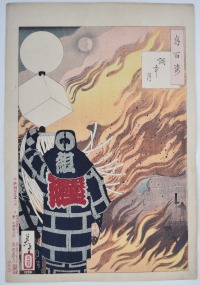 A silhouetted fireman faces a conflagration; in his left hand he holds a matori, a three-dimensional standard which identifies him and his location. Enchu no tsuki, “Moon and Smoke” from Tsuki hyakushi, “One Hundred Aspects of the Moon.” Published by Akiyama Buemon (Akiyama Seikichi) 1885-1892, this being 1886. The firemen’s heavily-quilted jackets were soaked in water to better enable them to withstand the heat. They were notorious for their rowdy behaviour and rivalrous nature leading to open hostility with other groups such as sumo wrestlers. Fires were a constant threat due to the building materials used, and firefighters were not above starting fires themselves in order to be the first on the scene (especially if they were in the construction business).