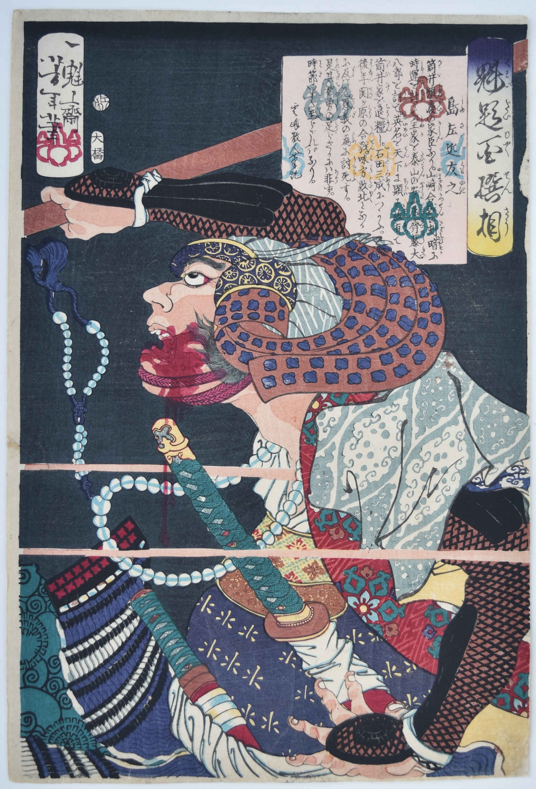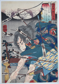 Shows Shima Sakon Tomoyuki at the battle of Sekigahara, October 21, 1600. Shima was a commander of Ishida no Mitsunari’s forces against Tokugawa Ieyasu and was shot by riflemen (although his body was not found). He is shown being hit by a hail of bullets, his juzo (rosary) swinging in the air. From a set Kaidai hyaku senso “Yoshitoshi’s Selection of One Hundred Warriors.” Sixty-five prints published by Ohashiya Yashichi (Odawaraya Yashichi) between 1868 and 1869, this being 1868. The text in the square cartouche in this set refers to prominent warriors in the internecine wars of the 16th century, but in fact the subjects are Shogitai soldiers (those that held out against the Imperial forces and were massacred at Ueno, 4/7/1868). An excellent set.