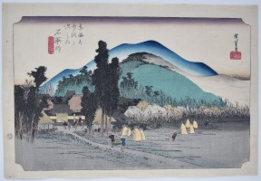 Station Ishiyakushi from Tokaido gojusan-tsugi no uchi, “Fifty-three Stations of the Tokaido.” This seminal work was possible because Hiroshige was asked to accompany an official procession along the Tokaido Road from Edo to Kyoto in 1832, and he made numerous sketches to document the journey. An evening scene in late autumn showing the village with the Ishiyakushi-ji (temple) on the left. This housed a stone image of Yakushi Nyurai, the Buddha of medicine. Pilgrims came in the hope of being healed, but they seldom stayed preferring to move on to Shono, the next station, which was only 3 km away. Because of the sets popularity, it was reprinted many times and there are a plethora of late impressions. Early printings are hard to find. Published by Hoeido (Takenouchi Magohachi) and Tsuruya Kiemon (Senkakudo) 1833-34.