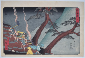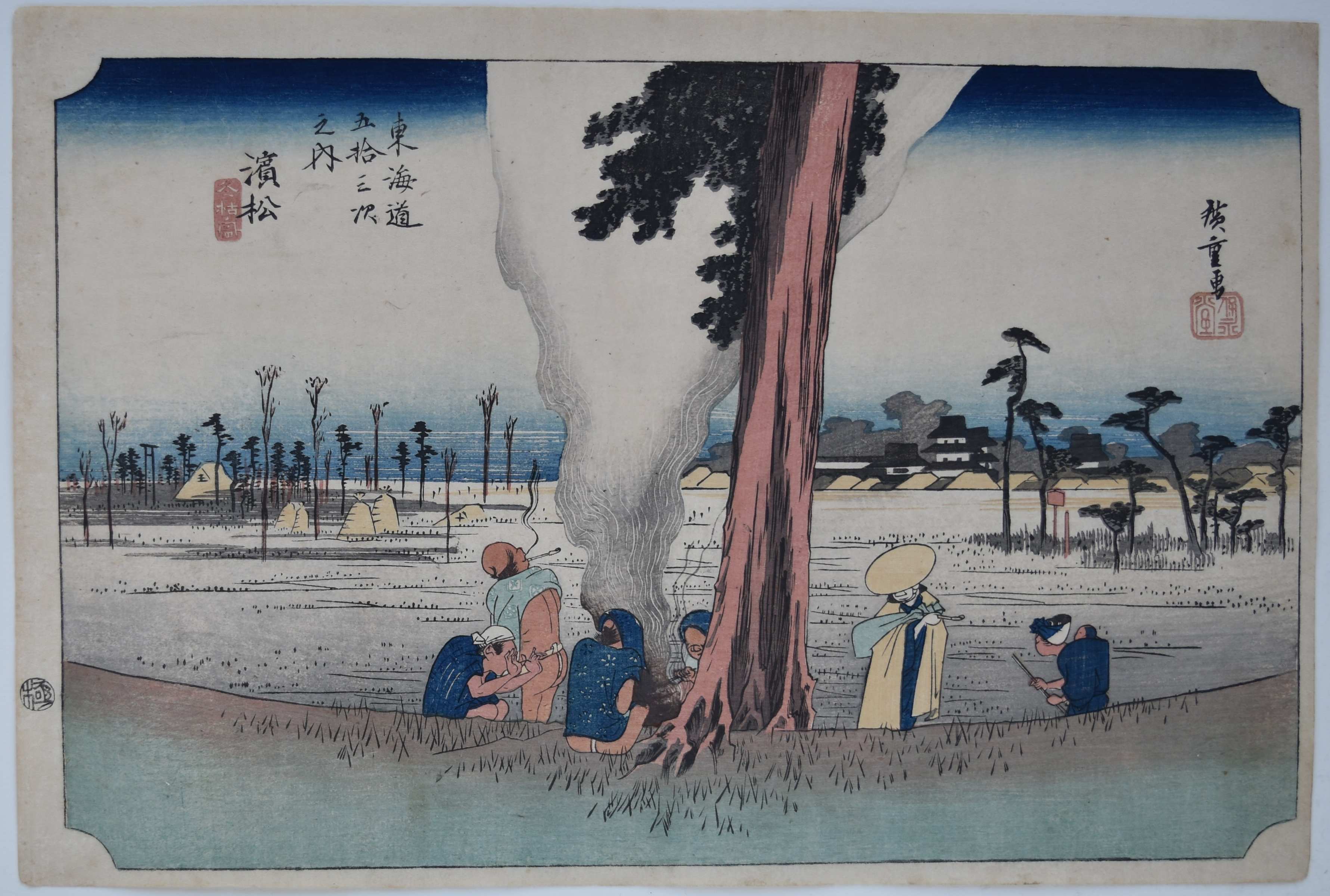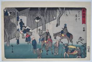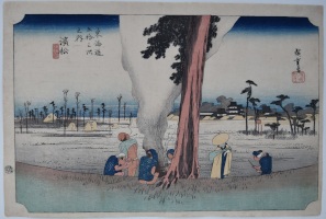 Station Hamamatsu from Tokaido gojusan-tsugi no uchi, “Fifty-three Stations of the Tokaido.” This seminal work was possible because Hiroshige was asked to accompany an official procession along the Tokaido Road from Edo to Kyoto in 1832, and he made numerous sketches to document the journey. A winter scene with farmers warming themselves around a fire. Hamamatsu Castle in the distance. Because of the set’s popularity, it was reprinted many times and there are a plethora of late impressions. Early printings are hard to find. Published by Hoeido (Takenouchi Magohachi) and Tsuruya Kiemon (Senkakudo) 1833-34.