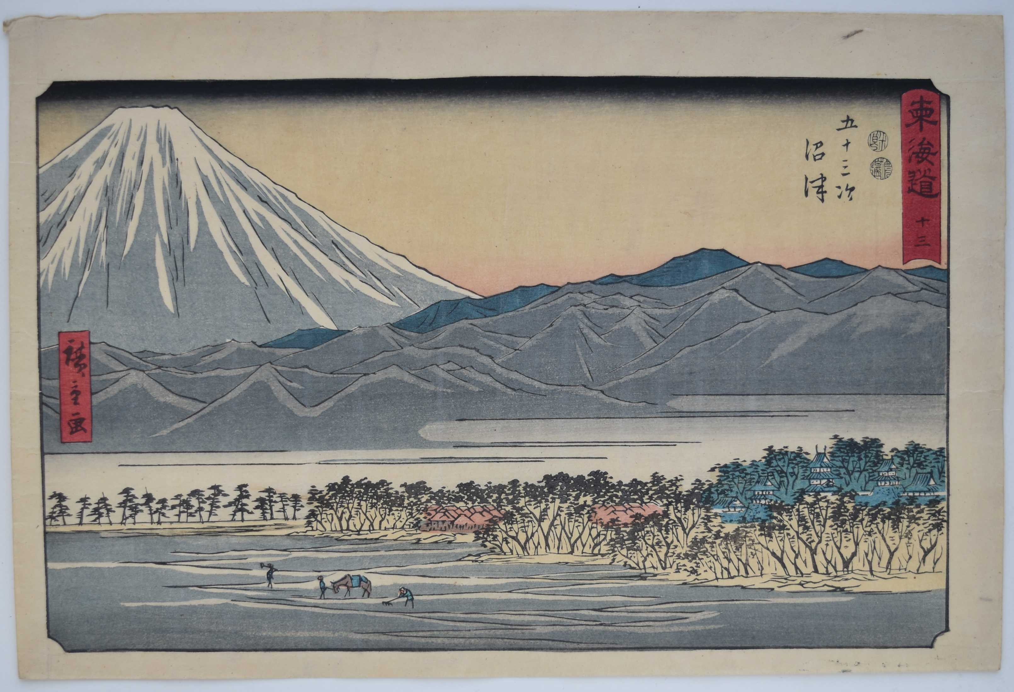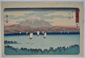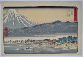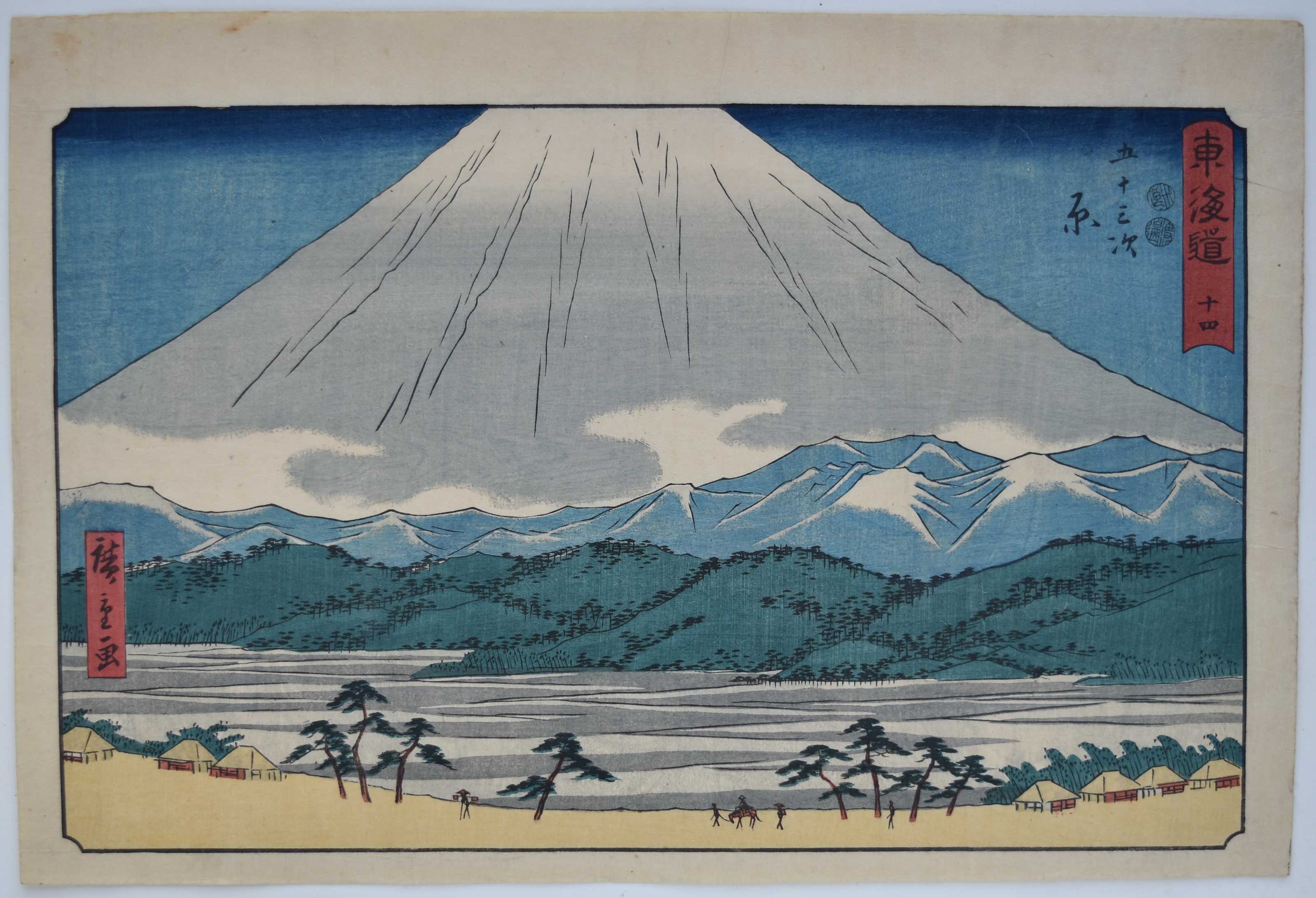 Station Numazu from a set Tokaido gojusan tsugi, “The Fifty-three Stations of the Tokaido Road,” aka the Reisho Tokaido from the clerical script used in the title, or the Marusei Tokaido after the publisher Maruya Seijiro (Marusei) who published the set 1847-52. An impressive view of Mount Fuji seen from the plains of Suruga. The village of Numazu is seen on the right amongst the trees.