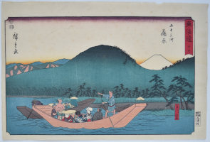 Station Kanbara from a set Tokaido gojusan tsugi, “The Fifty-three Stations of the Tokaido Road,” aka the Reisho Tokaido from the clerical script used in the title, or the Marusei Tokaido after the publisher Maruya Seijiro (Marusei) who published the set 1847-52. Kanbara, Fujikawa funawatashi, “Kanbara, Ferryboat on the Fuji River.”