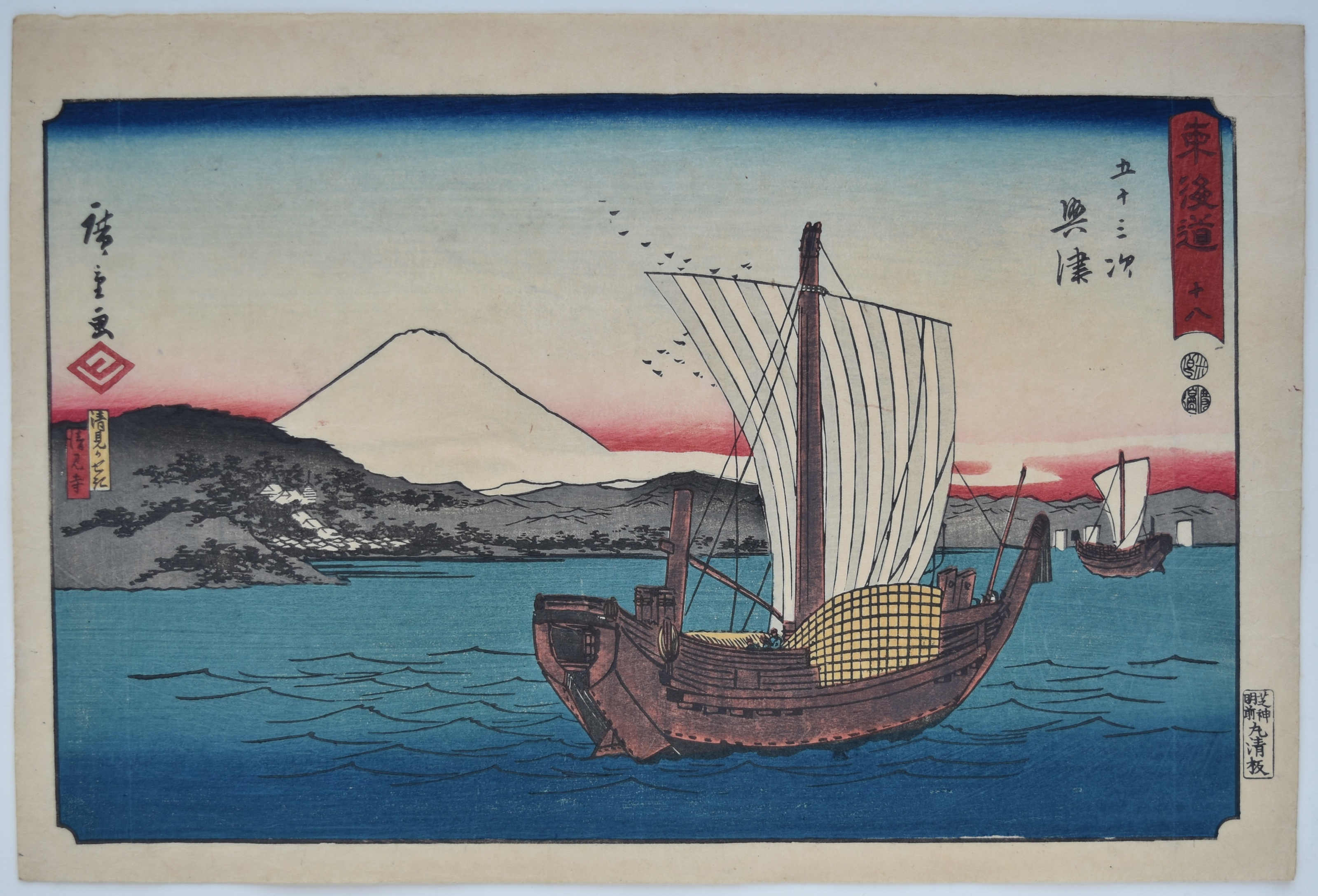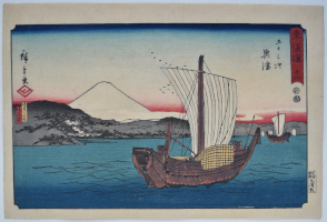 Station Ejiri from a set Tokaido gojusan tsugi, “The Fifty-three Stations of the Tokaido Road,” aka the Reisho Tokaido from the clerical script used in the title, or the Marusei Tokaido after the publisher Maruya Seijiro (Marusei) who published the set 1847-52. Located on the west side of Suruga Bay, close to the famous beauty spot of Miho no Matsubara.