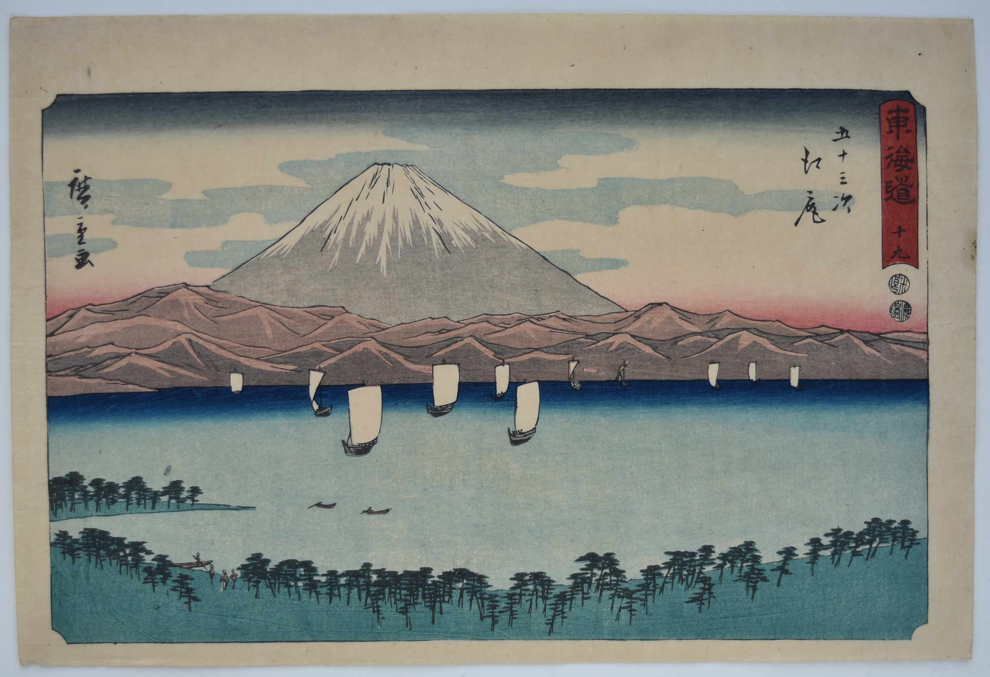 Fine, early impression. Beautiful blue bokashi on the distant Suzuka Mountains: Late impressions often have crude wiping of this block. Fine colur and condition. Signed Hiroshige ga.