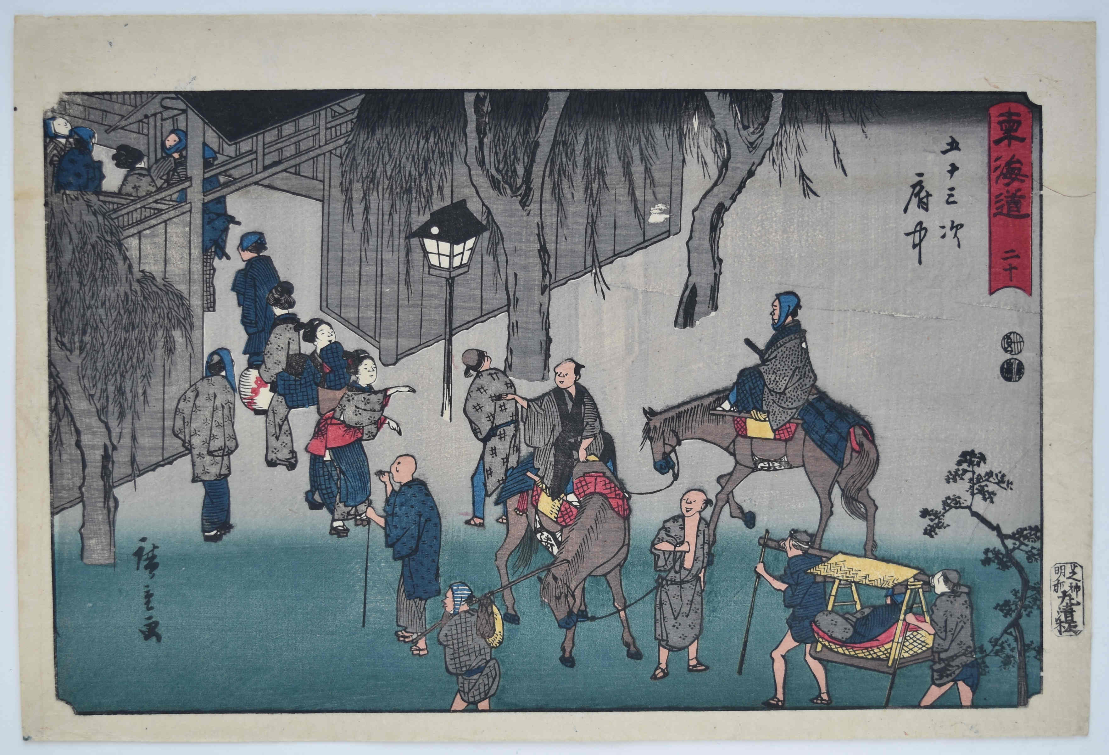 Station Fuchu from a set Tokaido gojusan tsugi, “The Fifty-three Stations of the Tokaido Road,” aka the Reisho Tokaido from the clerical script used in the title, or the Marusei Tokaido after the publisher Maruya Seijiro (Marusei) who published the set 1847-52. A night scene with travellers arriving at an inn. This was the largest post town on the Tokaido and served as the castle town for Sumpu Castle, the seat of the Tokugawa clan.