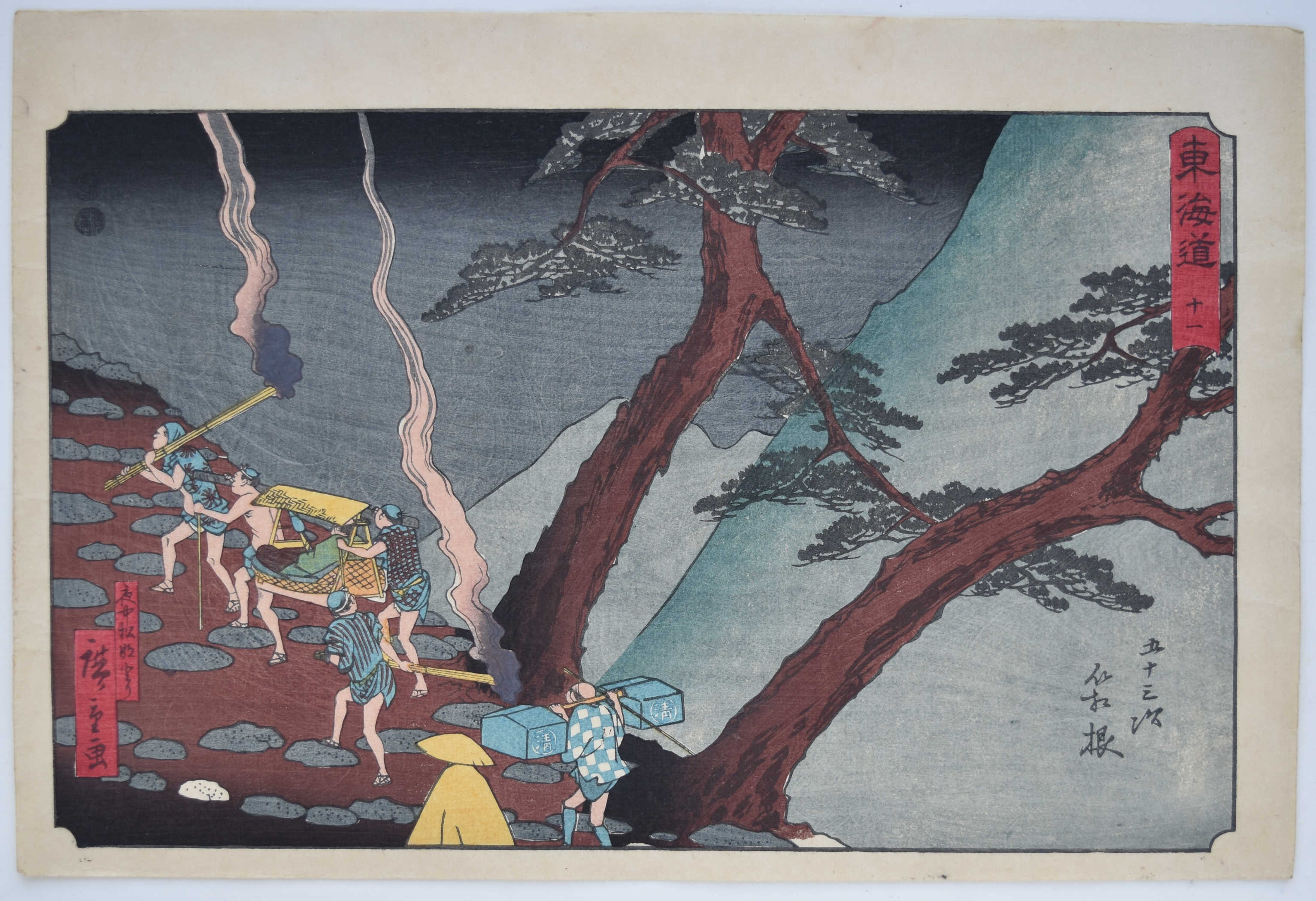 Station Hakone from a set Tokaido gojusan tsugi, “The Fifty-three Stations of the Tokaido Road,” aka the Reisho Tokaido from the clerical script used in the title, or the Marusei Tokaido after the publisher Maruya Seijiro (Marusei) who published the set 1847-52. Hakone, yonaka taimatsu tori, “Hakone, Travelling with Pine Torches at Night.” Porters lighting the way for a palanquin with firebrands on a mountain path. A beautiful design.
