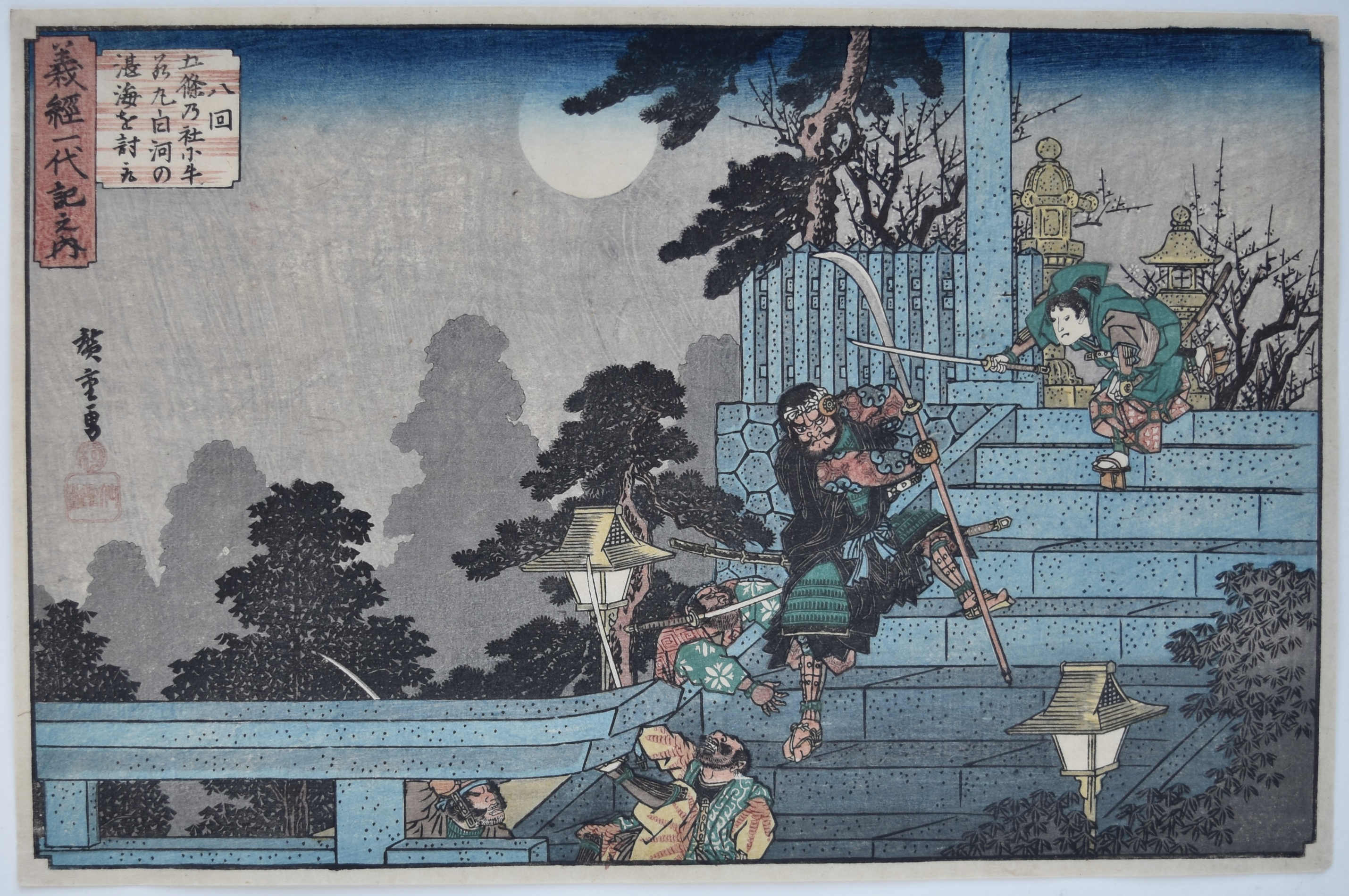 Ushiwakamaru (Yoshitsune) defeats the priest Tankai of Shirakawa at the Gojo Shrine under a full moon. Hachikai, Gojo no Yashiro ni Ushiwakamaru Shirakawa no Tankai o uchitori from the set Yoshitsune ichidaiki no uchi, “The Life of Yoshitsune.” Published by Tsuruya Kiemon (Senkakudo) 1832-34.