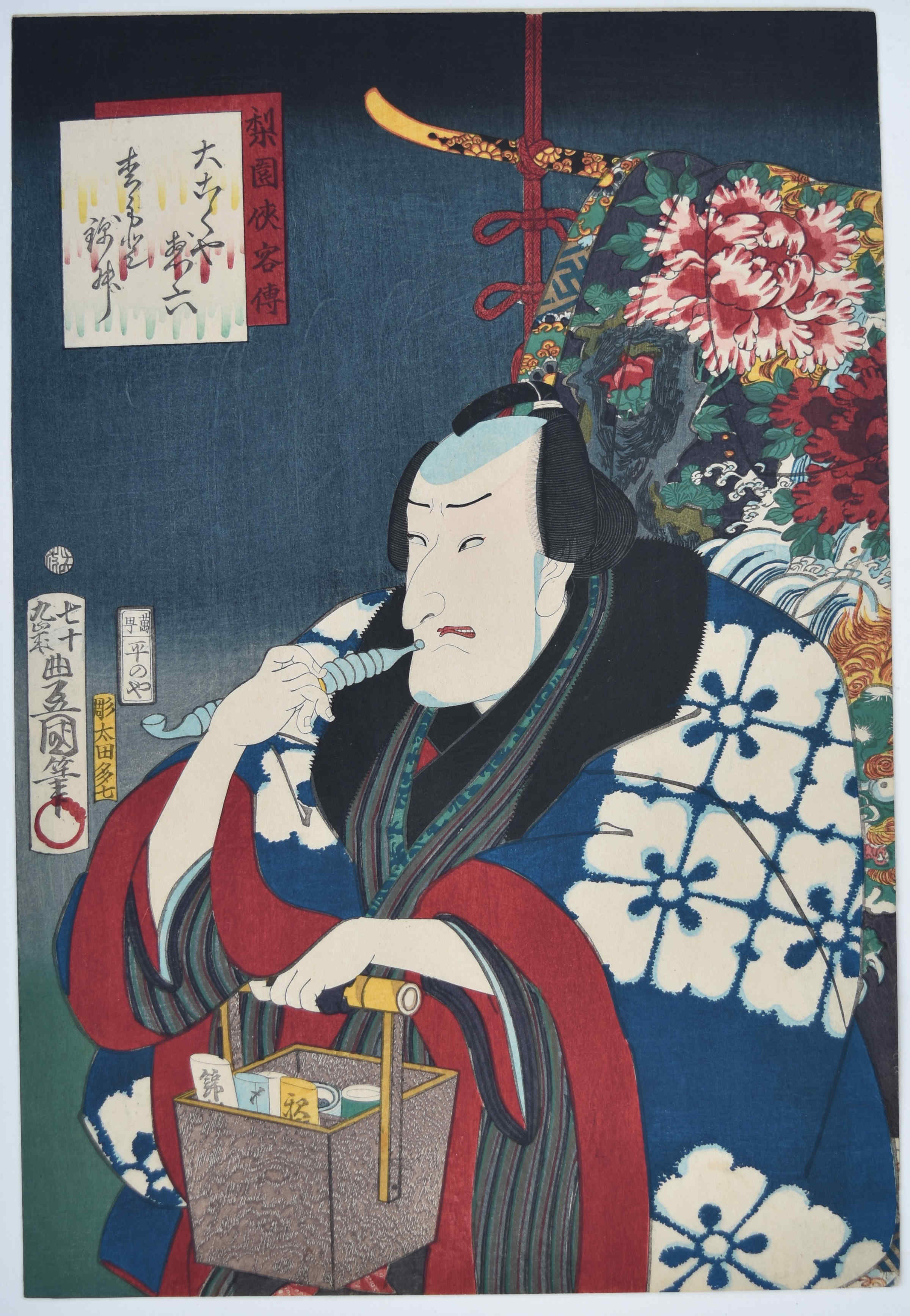 The actor Matsumoto Koshiro VI as the otokodate (a roguish yet honourable character) Daikokuya Soroku from a set Rien kyokaku-den, “The Story of a Chivalrous Man of the Theatrical World.” The set published by Hiranoya Shinzo (Hirashin) 1864. Soroku is the owner of a house of assignation called Daikokuya in the Shin-Yoshiwara. This is from the de-luxe edition employing only the finest pigments, block-cutting and printing. (The block-cutter was Ota Komakichi – highly regarded.) There are later editions without the embellishments. Some other late Kunisada sets have the same enrichments, such as the so-called Famous Actors Past and Present set.