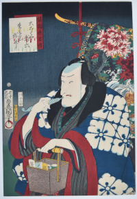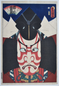The actor Ichikawa Ebizo V (Ichikawa Danjuro VII) in a Shibaraku scene as the warrior Usui Arataro Sadamitsu (Taira no Tadamichi) adopting the cross-eyed mie expression to show great emotion. From an untitled set of large-head portraits of actors, past and present, published by Ebisuya Shoshichi (Kinshodo) between 1860 and 1865, this being 1860. Kunisada, in his old age, planned this set to have 150 designs but only 72 were completed (with the help of Utagawa Yoshitora). Only the best materials and most experienced engravers and printers were employed, the cost being mitigated by the Mitani copper and iron merchant family.