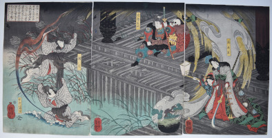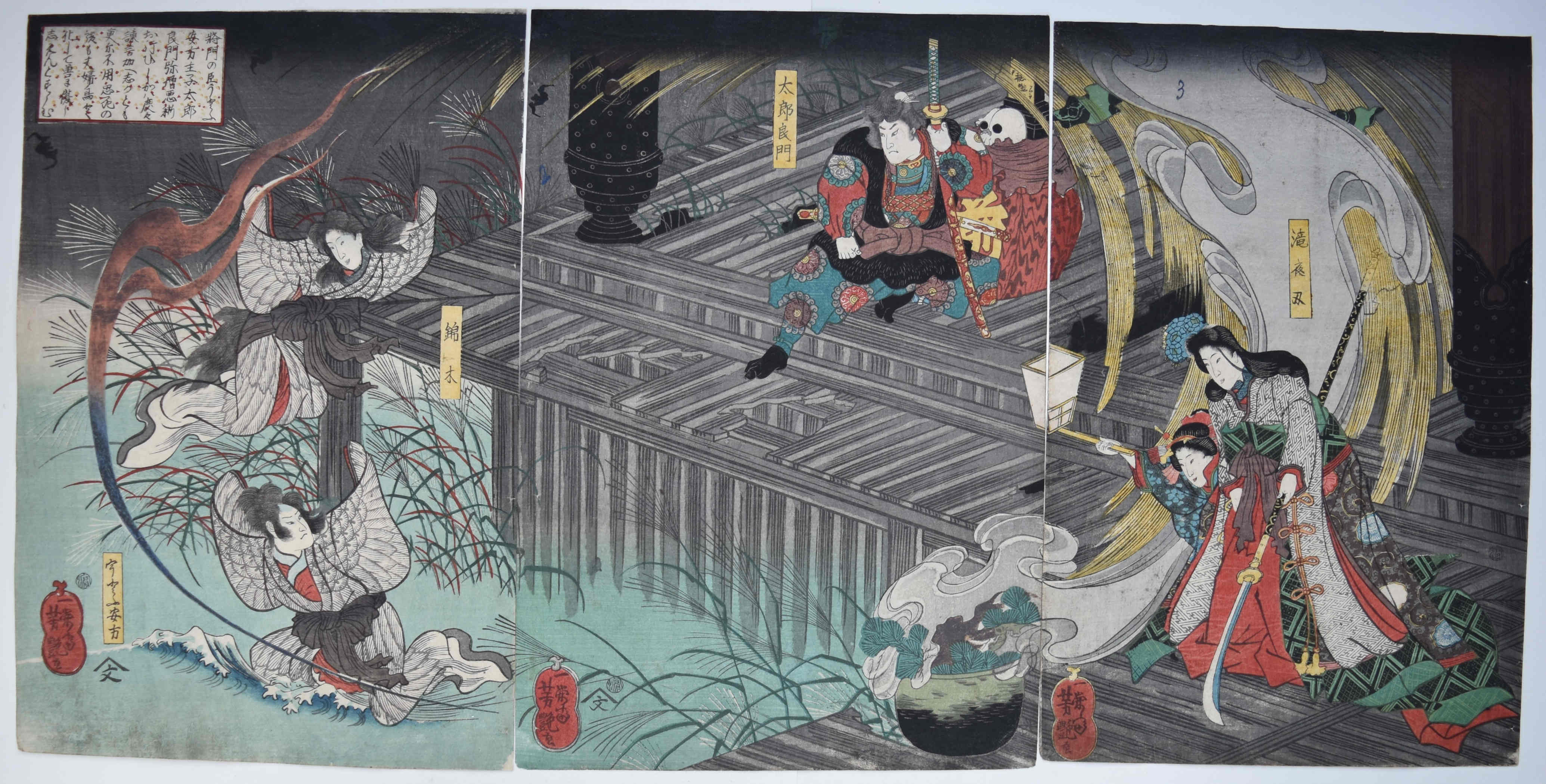 A triptych Uto Yasukata chugi den, “The Tale of Faithful Uto Yasukata.” Shows Shogun Taro Taira no Yoshikado (centre); Princess Takiyasha right); and Uto Yasukata and his wife (far left) turning into birds. Set in the ruins of Soma Palace. Takiyasha releases a ghost from a cauldron. A difficult triptych to interpret. (More information is available on the Lyon collection website: woodblockprints.org.) Published by Tsujiokaya Bunsuke (Tsujibun) 1852-53.
