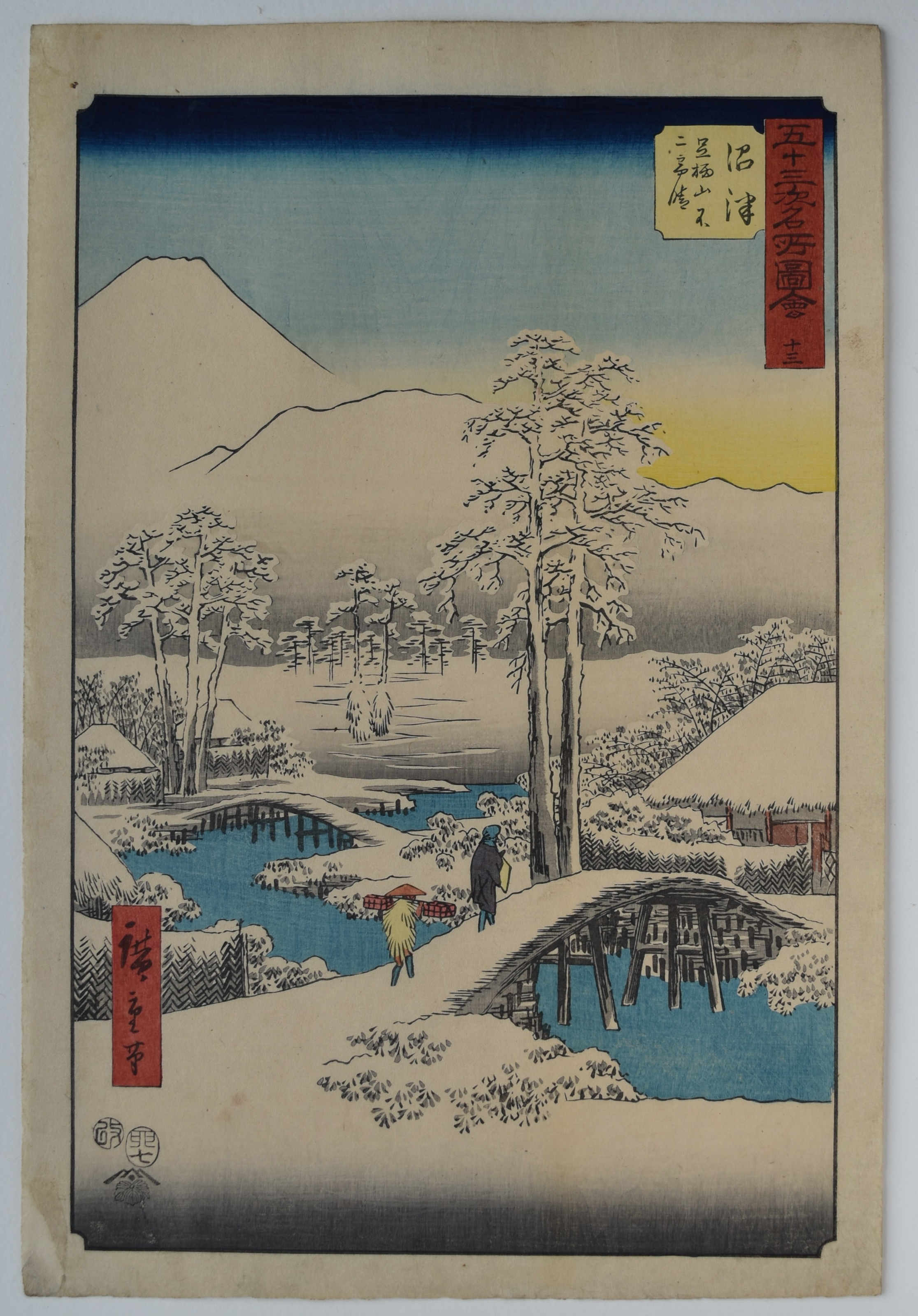 Numazu Ashigarayama Fuji no yukibare, “Numazu: Mount Fuji and Mount Ashigara after Snow” from Gojusan tsugi meisho zue, “Famous Places on the Fifty-three Stations.” The so-called “Upright Tokaido.” Shows two travellers crossing a trestle bridge over the Kise River before entering Numazu village seen on the left. Mount Fuji in the distance. Published by Kichizo (Koeido Tsutaya), 1855. There are many late editions of this set with the skies on the two snow scenes printed black. A fine snow design.