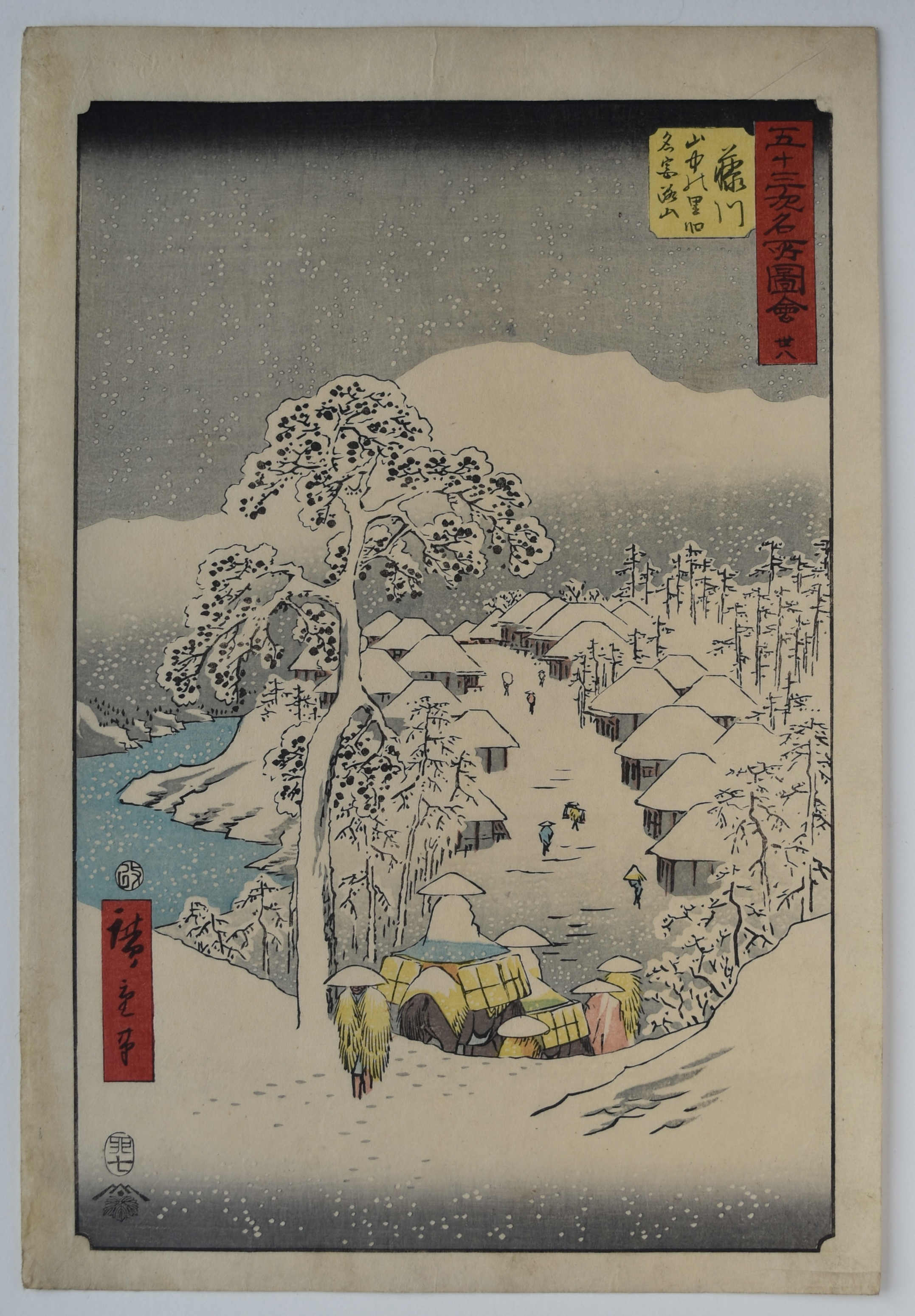 Fujikawa sanchu no sato kyumei Miyakoyama Fujikawa, “Fujikawa: Mountain Village, Formerly called Mount Miyako” from Gojusan tsugi meisho zue, “Famous Places on the Fifty-three Stations.” The so-called “Upright Tokaido.” Shows travellers in heavy snow entering Fujikawa village down a steep slope. Published by Kichizo (Koeido Tsutaya), 1855. There are many late editions of this set with the skies on the two snow scenes printed black. A fine snow design.
